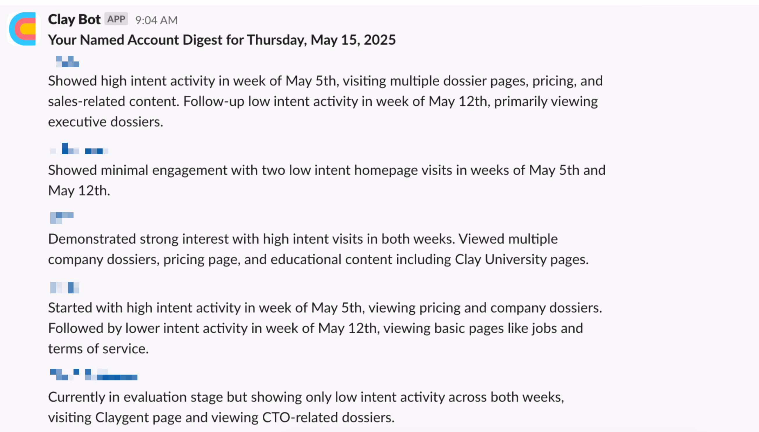 At Clay, we create bundled Slack messages to our reps to show them aggregate signal activity across their top 5 named accounts with open opportunities and also without open opportunities.